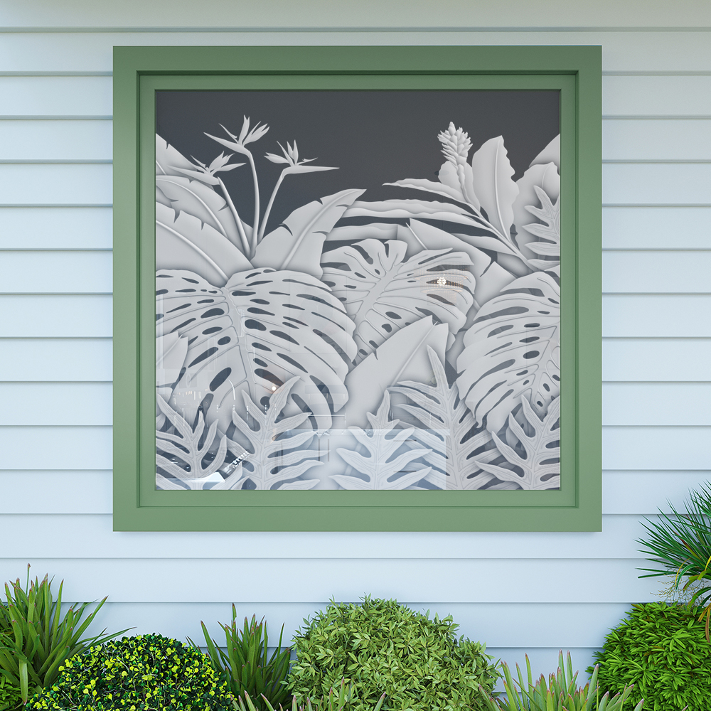 Add an aesthetic touch and varying degrees of privacy to your glass windows and doors with Kaholo’s tropical designs. Get the look of real sand-blasted or acid-etched glass at a fraction of the cost! While our product looks like the real thing, it’s ecologically safer and cleaner than sand-blasting and acid-etching, and it’s replaceable because it doesn’t permanently damage the surface of your glass (does not permanently mar the glass).