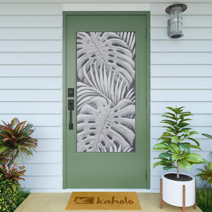 Add an aesthetic touch and varying degrees of privacy to your glass windows and doors with Kaholo’s tropical designs. Get the look of real sand-blasted or acid-etched glass at a fraction of the cost! While our product looks like the real thing, it’s ecologically safer and cleaner than sand-blasting and acid-etching, and it’s replaceable because it doesn’t permanently damage the surface of your glass (does not permanently mar the glass).