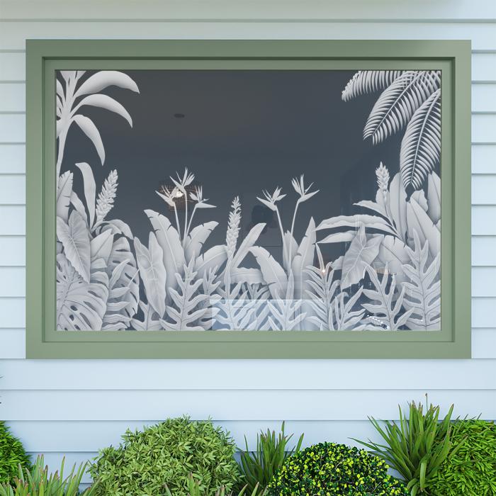 Add an aesthetic touch and varying degrees of privacy to your glass windows and doors with Kaholo’s tropical designs. Get the look of real sand-blasted or acid-etched glass at a fraction of the cost! While our product looks like the real thing, it’s ecologically safer and cleaner than sand-blasting and acid-etching, and it’s replaceable because it doesn’t permanently damage the surface of your glass (does not permanently mar the glass).