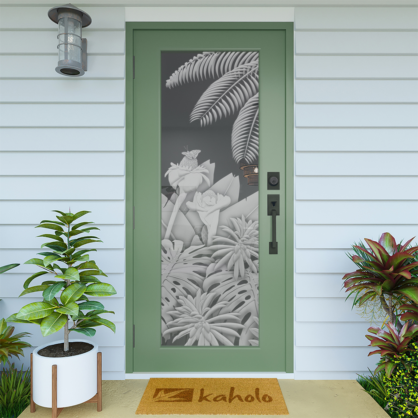 Kaholo’s DIY designs are created using the window film industry’s best, most durable window film materials, designed by experienced artists and manufactured with the latest large format printers. The level of detail halftones and gradient shading is clearly represented in every piece of art and seldom found in the industry. Perfect on any door, kitchen cabinet, sidelight, picture window, pantry door, shower door, bathroom mirror and more – get creative! Get tropical! Get Kaholo Glass Art!