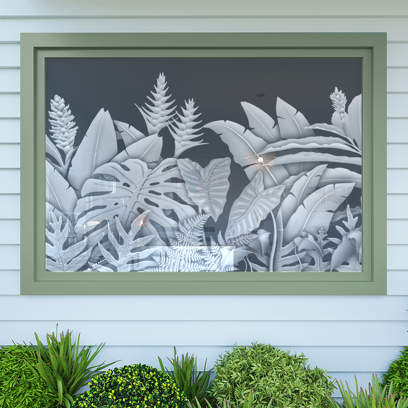 Add an aesthetic touch and varying degrees of privacy to your glass windows and doors with Kaholo’s tropical designs. Get the look of real sand-blasted or acid-etched glass at a fraction of the cost! While our product looks like the real thing, it’s ecologically safer and cleaner than sand-blasting and acid-etching, and it’s replaceable because it doesn’t permanently damage the surface of your glass (does not permanently mar the glass).